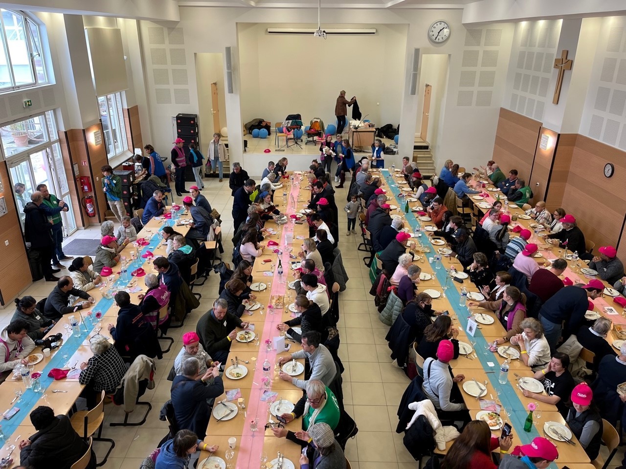 Dimanche 19 novembre, à l’issue de la journée mondiale des pauvres, organisée à l’initiative du Pape François, le Lycée Notre-Dame de Boulogne a accueilli le banquet organisé par l’association Fratello, diverses associations d’aide aux plus démunis et la paroisse Notre-Dame. Ce banquet a réuni dans la salle Saint-Louis près de 200 convives, gens de la rue, familles démunies, personnes âgées et isolées, avec des associatifs de Boulogne et d’ailleurs. Plusieurs élèves du Lycée assuraient le service à table,